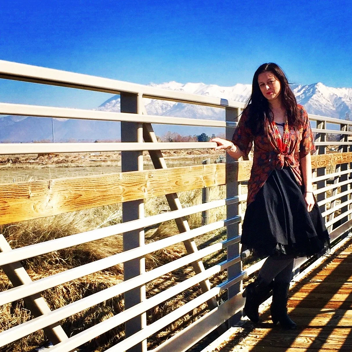 Woman standing on a bridge with snow-covered mountains in the background
